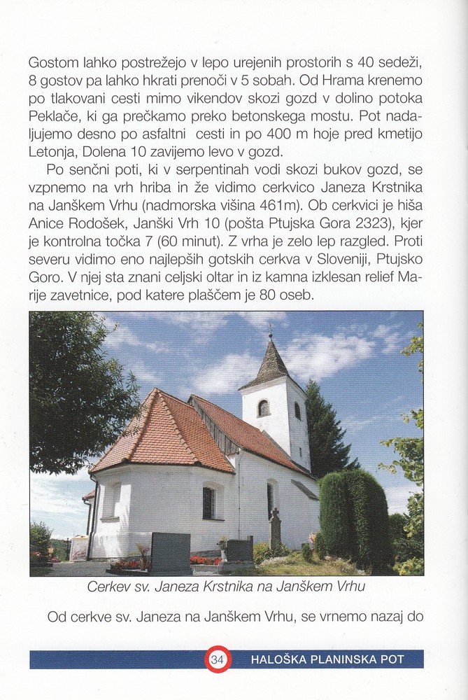 Ko se boste odločili za hojo po Halozah, si vzemite čas in pojdite po haloških gričih s posluhom za pokrajino in ljudi. Kdor hoče užiti Haloze se mora povzpeti iz dolin po bregovih na vrhove, od koder oko zazna čudovito sliko slemen in hrbtov, ki potekajo v različnih smereh. Sredi haloških gričev oko zasledi prijazne hišice nekdanjih viničarjev, nove, večje hiše, stare mogočne gosposke pristave in množico vikendov. Na pobočjih in vrhovih se belijo cerkve, stoje gradovi in ljudska znamenja. V jeseni kraljujejo na vrhovih in pobočjih klopotci, ki s svojo pesmijo varujejo grozdje.